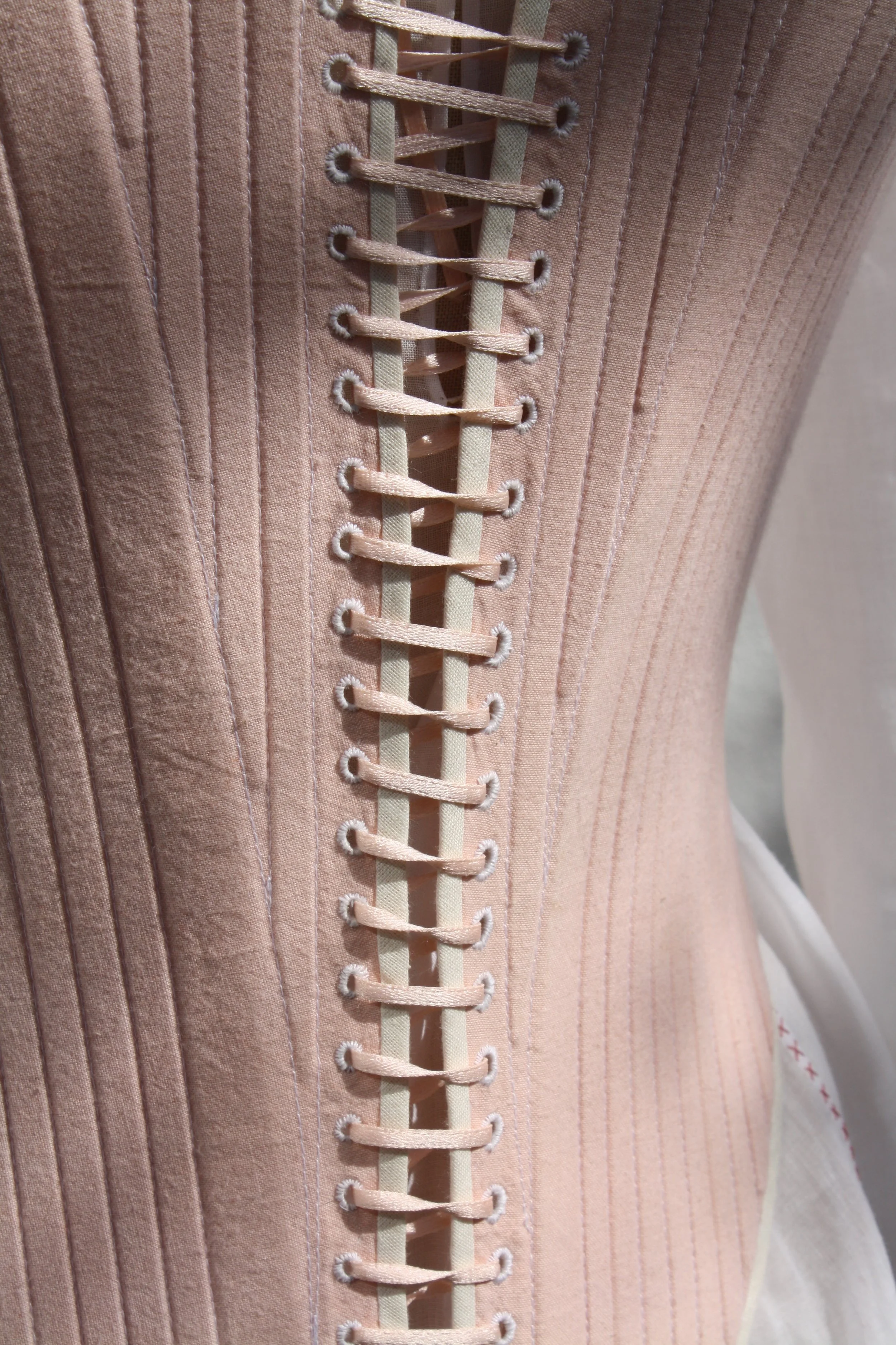 The stays are the 1603 effigy stays from Patterns of Fashion 5 - Janet Arnold, Jenny Tiramani, made in dyed calico and coutil. It was machine sewn together and then hand finished on seams and binding, including all 66 hand bound eyelets.